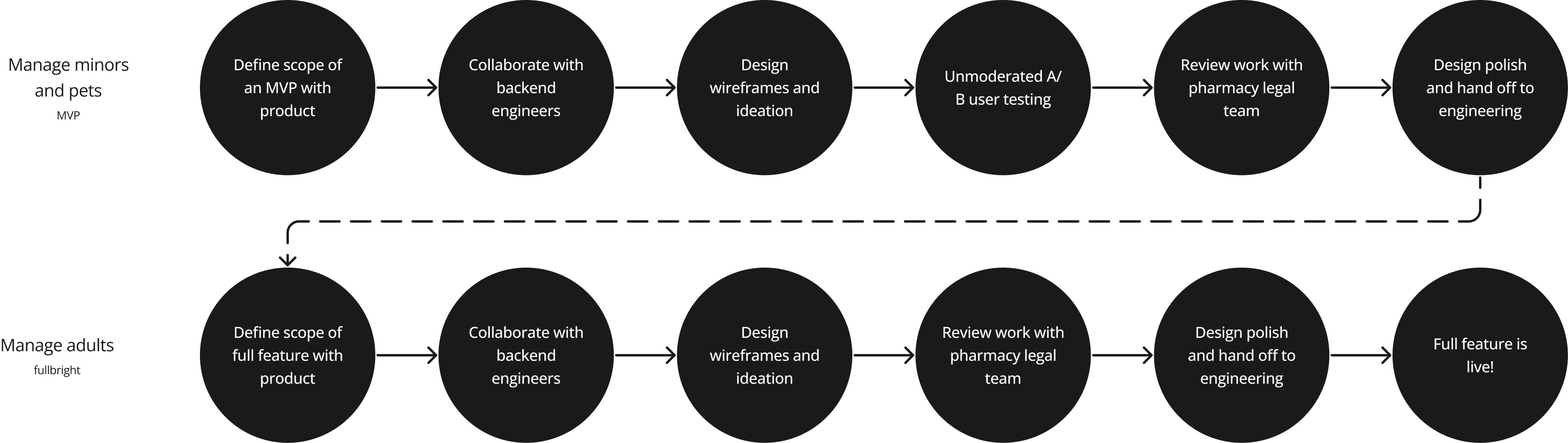 The business priority was to ship minors/pets first due to minors/pets being the most common user story for management, the high volume of customer complaints, and the simpler technical feasibility for connecting to a minor/pet.