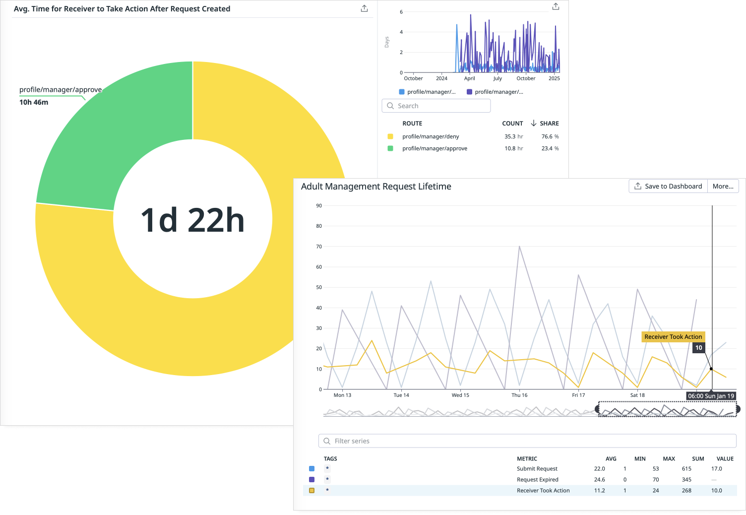 Adult to adult management requires a response from the receiver of the request to approve the management. When responded to, the request is currently taking just under 2 days average, which is good. However, 76.6% of the responses are a denial of the request. Additionally, many requests are not getting responded to at all. Our team could explore opportunities to better message the receiver of the request via SMS, email, and push notifications.