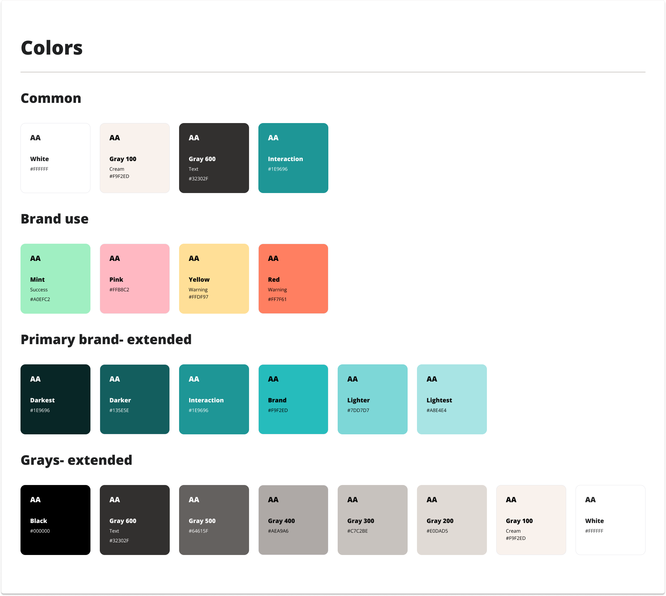 I expanded upon the existing brand guidelines to adapt components for use in UI. The focus was on building a foundational component library that could scale with the app. I tweaked colors for appropriate accessibility contrast, defined what should be default text color, background colors, and the interactive link color. In expanding on the brand, I defined a gradient palette to easily drop into Figma screens.